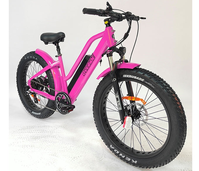 Embark on epic journeys and command attention with the **Unisex Crewzer**, Overide's flagship Fat Wheel Electric Bike. Tailored for ultimate comfort and style, this version features a lower crossbar, making it more accessible for women without compromising the rugged adventure-ready design. Whether cruising through city streets or tackling remote trails, the Unisex Crewzer brings a perfect blend of cutting-edge engineering and sleek style, now available in a bold and vibrant hot pink color for riders who want to stand out.